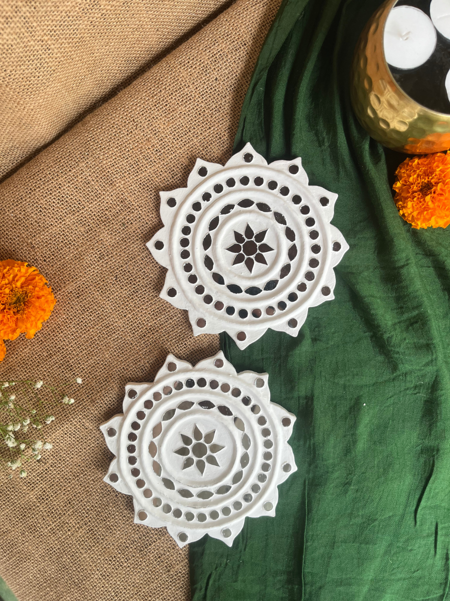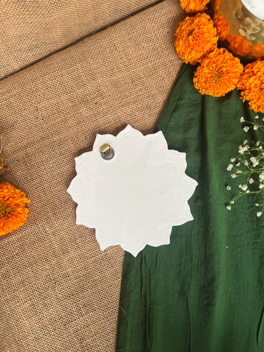 Bring warmth and charm to your home with this handcrafted sunflower diya holder. Featuring intricate Lippan mud and mirror detailing, it can be used as a small idol holder, candle display, or festive décor. Lightweight and versatile, it comes with a hook at the back for wall hanging but also looks stunning placed on the floor. Each piece is handcrafted, making it truly unique, with natural imperfections that add character and authenticity. Designed for indoor use, this exquisite piece adds a touch of traditional Indian artistry and festive elegance to any space.